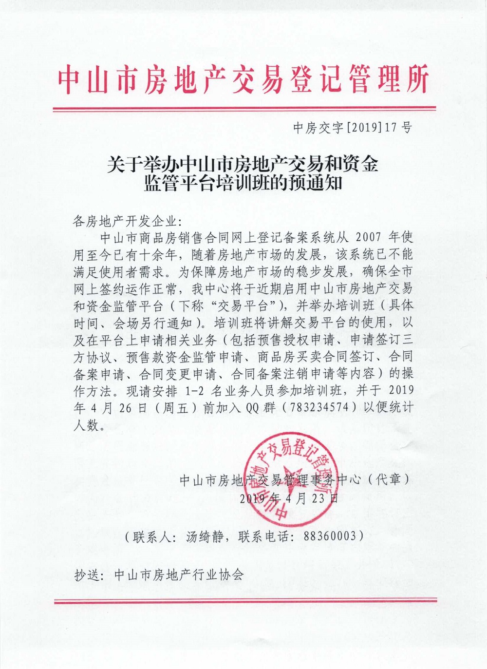 关于举办中山市房地产交易和资金监管平台培训班的预通知