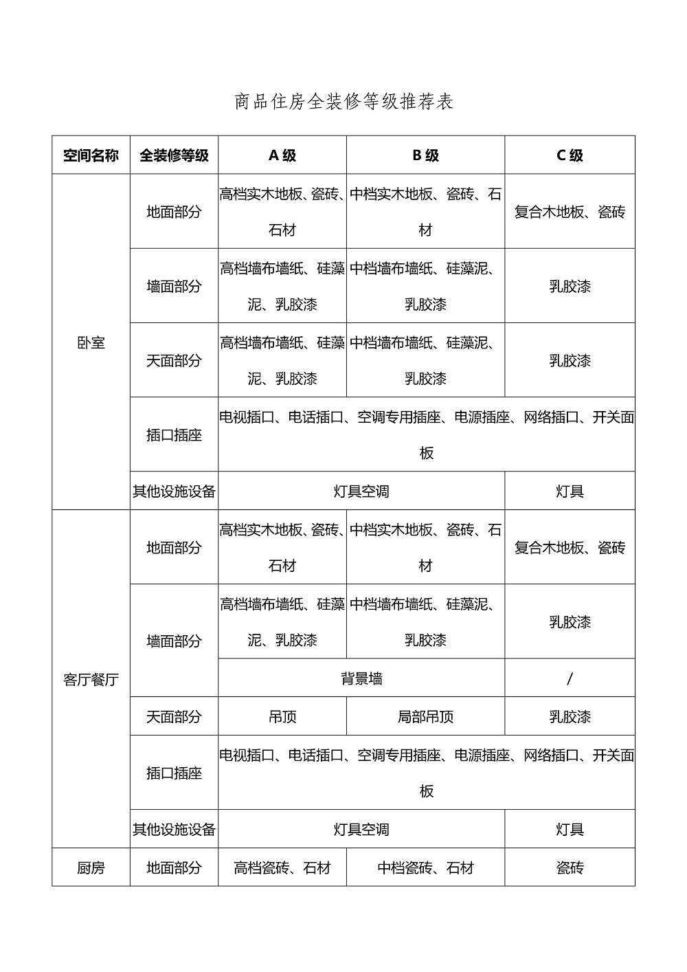 (一)商品住房全装修装修应达到基本使用标准,从装修入手,整合提高商品住房的品质,达到相应等级的舒适程度。